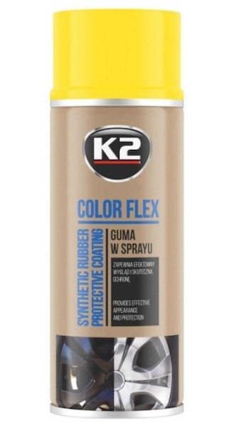 K2 COLOR FLEX 400 ml žlutá je sprej na bázi syntetického a kapalného kaučuku, který umožňuje okamžitou změnu barvy exteriérových prvků Vašeho vozu. Nejenom že na autě dobře vypadá, ale také vytváří ochrannou vrstvu a chrání tak od poletujících kamínků, prachu, soli apod. Chrání povrch před lehkým poškozením jako je poškrábání, špína, vlhkost, kyselé kapaliny, rez, ale i olej a mastnota. Může nastříkat i ocelové a hliníkové ráfky, nárazníky, kov, sklo, plast a mnoho dalších materiálů.