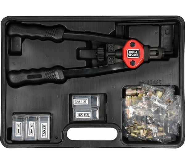 Rruční nýtovací pákové kleště Yato pro maticové nýty. Pákový mechanizmus významě snižuje námahu při práci.